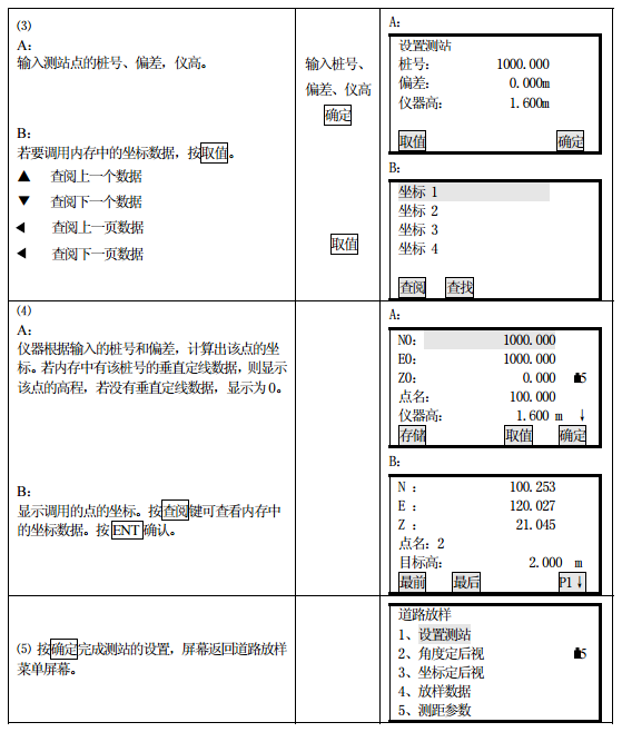 測(cè)站的設(shè)置可以通過鍵盤或從儀器內(nèi)存讀取的方式輸入。鍵盤輸入是按“樁號(hào)、偏差” 的形式輸入的,而從內(nèi)存中讀取的是 N、E、Z 坐標(biāo)形式。